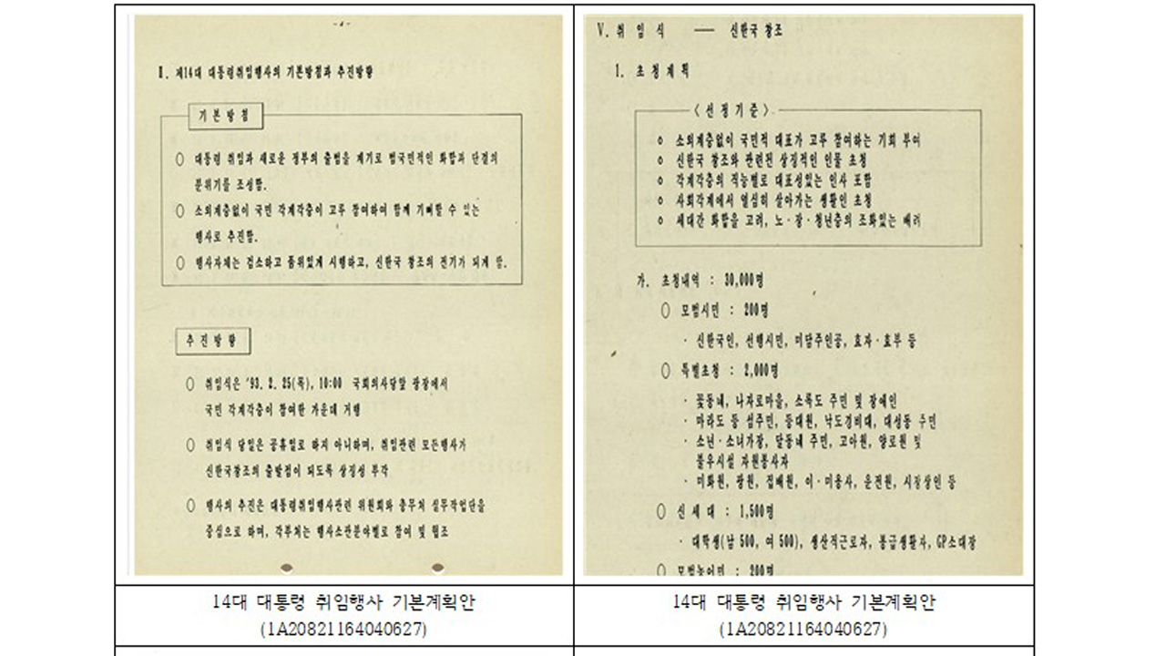 제공되는 주요 기록물은 제1대∼제19대 대통령까지의 취임사와 취임사 영상, 제14대∼제18대 대통령의 취임식 추진 방향과 초청 계획, 행사장 배치도 등이 담긴 취임행사 계획서 등 총 45건입니다.