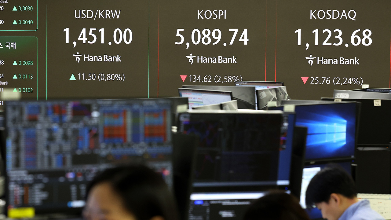 ▲ 코스피가 하락 출발하며 5,100선이 깨진 2일 서울 중구 하나은행 딜링룸 현황판에 코스피와 코스닥지수 등이 표시되고 있다.