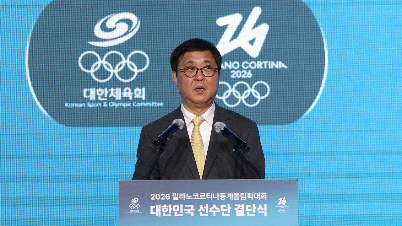 ▲ 지난달 22일 송파구 올림픽파크텔에서 열린 2026 밀라노 동계올림픽 선수단 결단식에서 최휘영 문화체육관광부 장관이 인사말을 하고 있다.