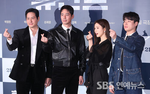 Park Hae-jun (from left), Zo In-sung, Shin Sae-kyeong and Park Jeongmin attended the film ‘HUMINT’ press screening and media Q&A at CGV Yongsan I’Park Mall in Yongsan-gu, Seoul, on Feb. 4 and posed for photos.