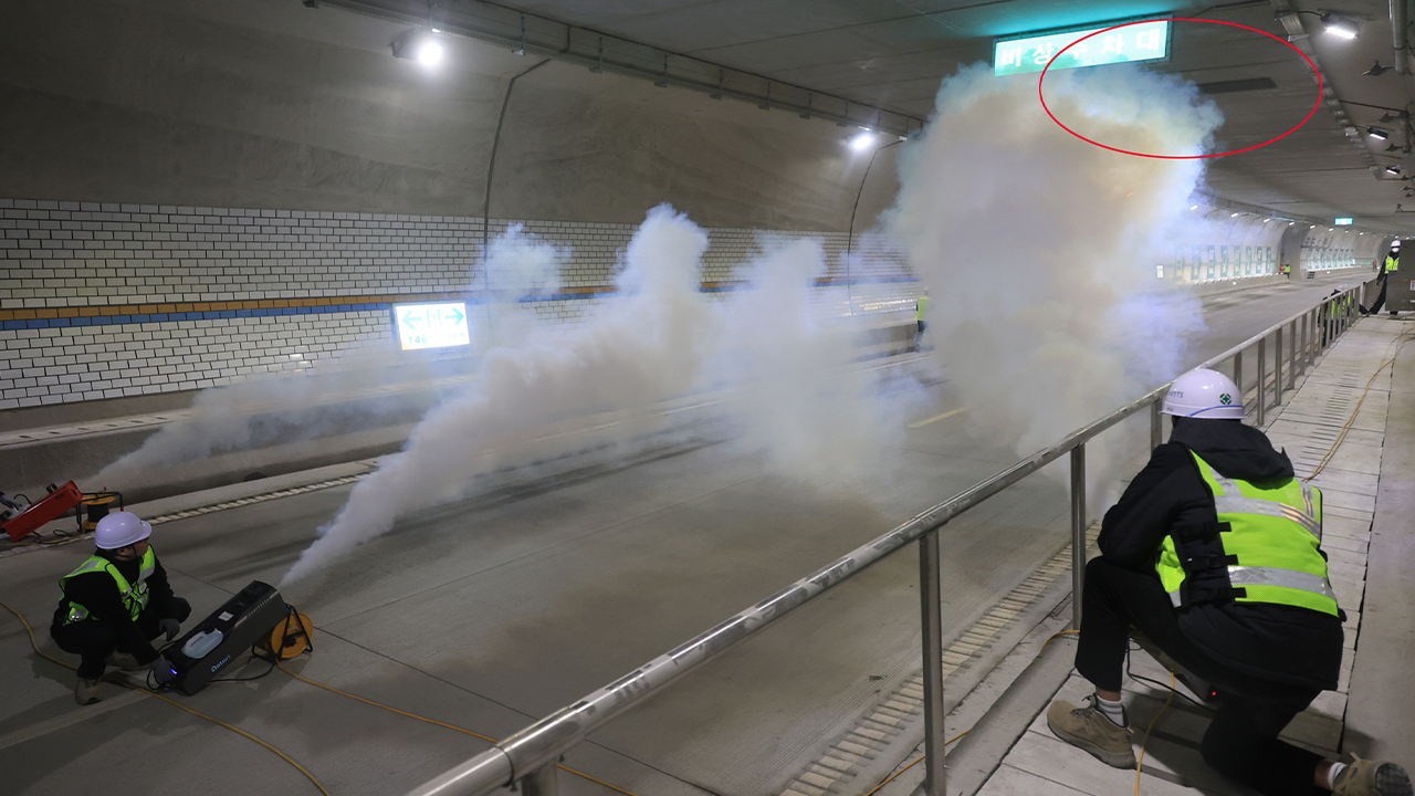 앞서 3개의 연기 발생기를 이용해 터널 내부에 40초가량 연기를 뿜어냈는데, 불과 20여 초 뒤 연기가 제연 설비 안으로 모두 빨려 들어가며 눈으로는 보이지 않았습니다.
