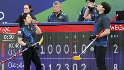 ▲ 컬링 믹스더블 국가대표 김선영, 정영석이 5일(현지시간) 이탈리아 코르티나담페초 컬링 올림픽 스타디움에서 열린 밀라노·코르티나 동계올림픽 이탈리아와의 라운드로빈 경기에서 엔드 중간 음료를 마시고 있다.