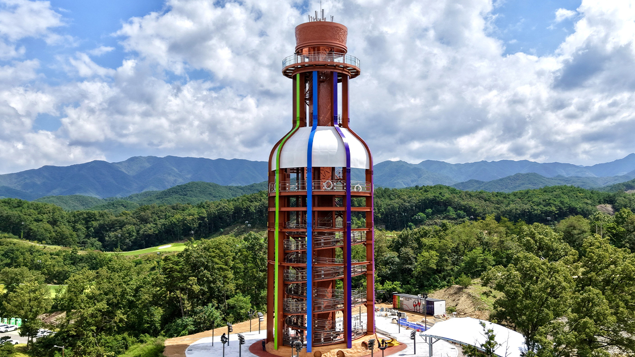 지방소멸대응기금 등 90억 원의 건설비용이 투입된 이 전망대는 와인병 모양으로, 회오리 형태의 계단을 따라 4개 층으로 구성됐습니다.