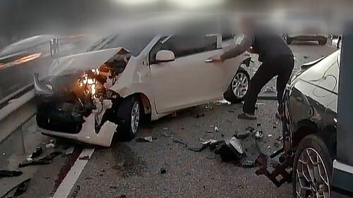 4중 추돌 사고의 충격으로 차량에서 불길이 피어오릅니다.