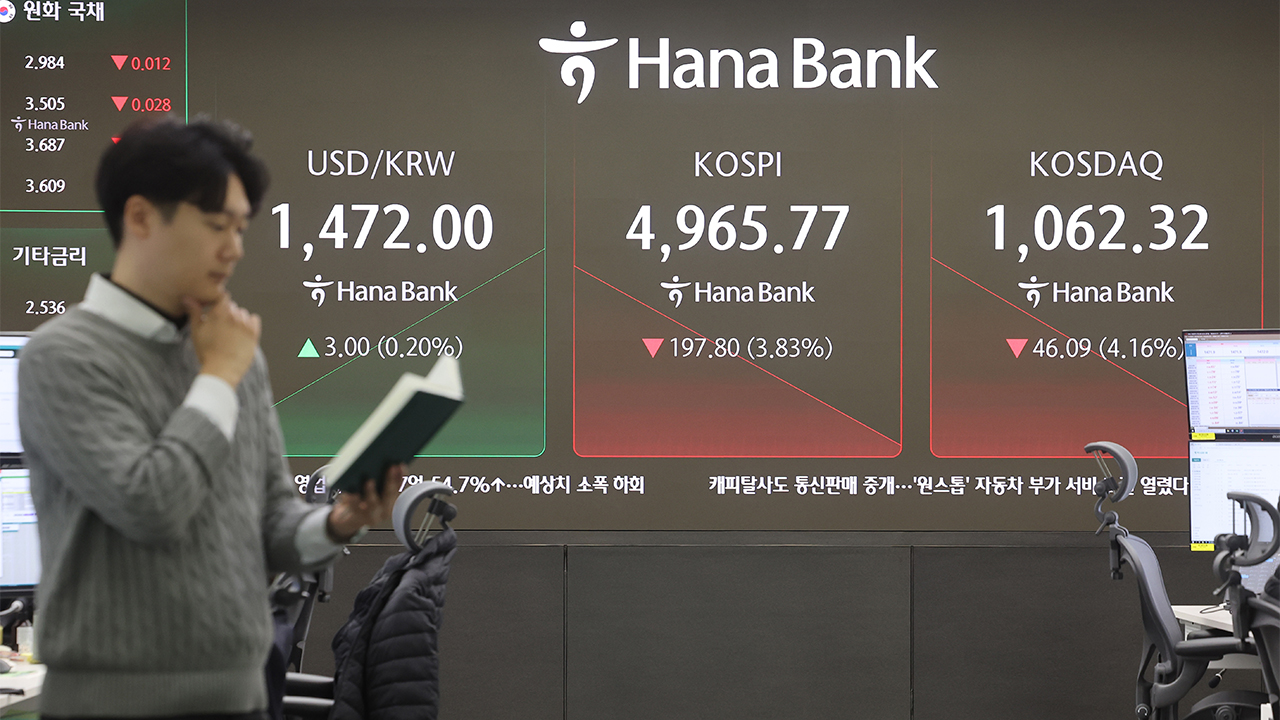▲ 코스피가 5,000선 아래로 떨어지며 출발한 6일 서울 중구 하나은행 딜링룸에서 직원이 업무를 보고 있다.