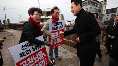 ▲ 국민의힘 장동혁 대표가 6일 오전 제주 서귀포시 표선면 거리에서 통일교·공천 특검 등을 요구하며 피켓시위를 하는 당원들을 만나고 있다.