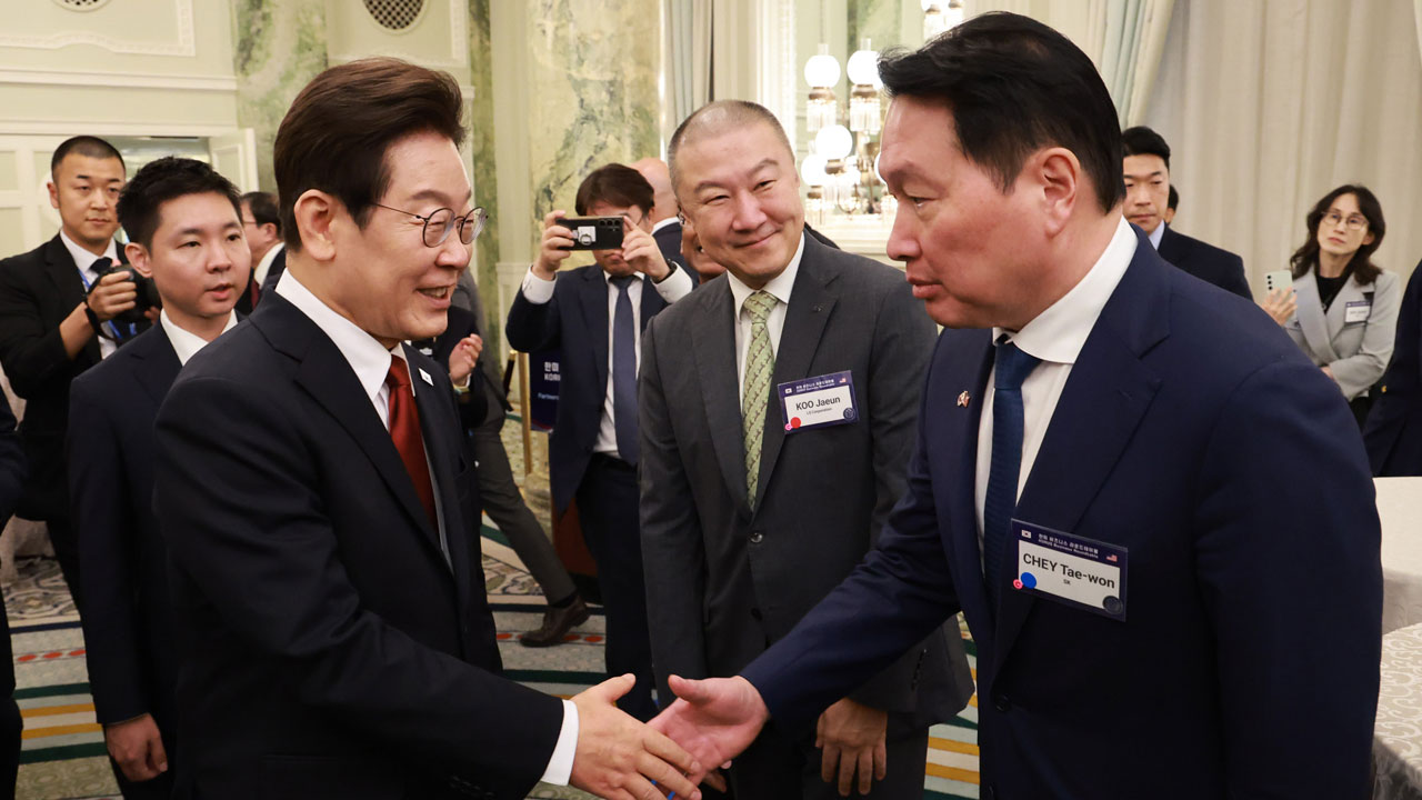 ▲ 이재명 대통령이 지난해 8월 25일(현지시간) 한미 비즈니스 라운드 테이블에서 최태원 대한상의회장 겸 SK그룹 회장과 악수하고 있다. 가운데는 구자은 LS 회장.