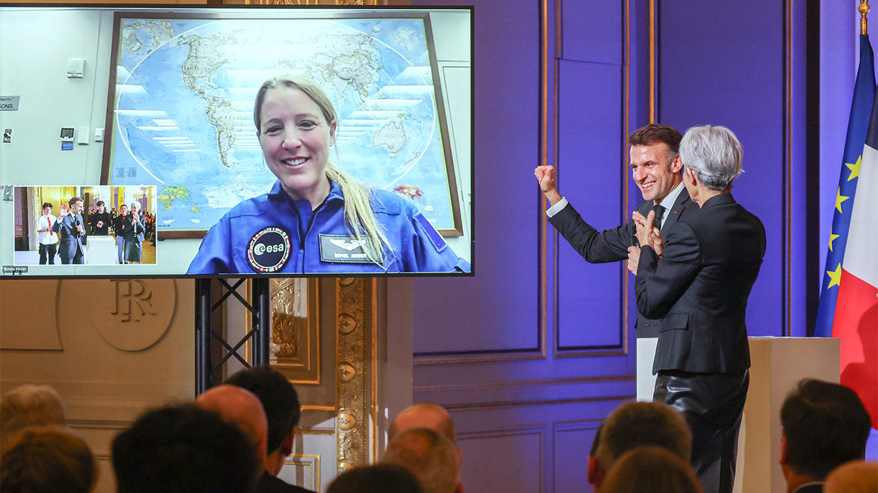 ▲ 에마뉘엘 마크롱 프랑스 대통령이 지난 5일(현지시간) 크루-12의 일원인 소피 아데노와 화상으로 대화하고 있다.