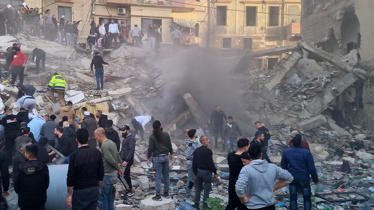 ▲ 9일(현지시간) 레바논 트리폴리의 건물 붕괴 현장에서 구조대가 인명 수색 작업 중이다.