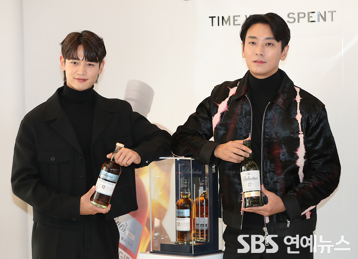 SHINee’s MINHO (left) and Ju Jihoon strike a pose at Ballantine’s whisky brand launch event held at Dragon City Hotel in Yongsan-gu, Seoul, on the afternoon of Jan. 12.Copyright Ⓒ SBS. All rights reserved. 무단 전재, 재배포 및 AI학습 이용 금지