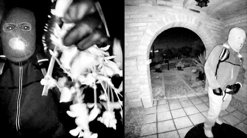 복면을 착용하고 장갑을 낀 괴한이 현관 앞으로 다가갑니다.