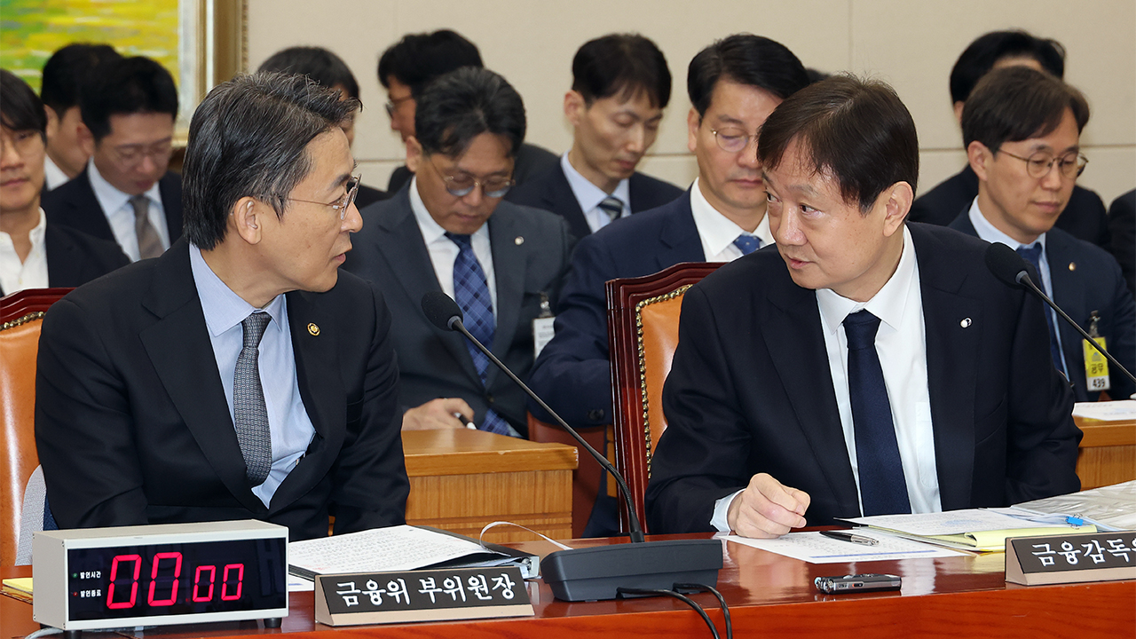 ▲ 이찬진 금융감독원장(오른쪽)과 권대영 금융위원회 부위원장이 11일 국회에서 열린 정무위원회의 국내 가상자산거래소 빗썸에서 발생한 거액의 비트코인 오지급 사태를 놓고 벌인 긴급 현안질의에 참석, 얘기를 나누고 있다.