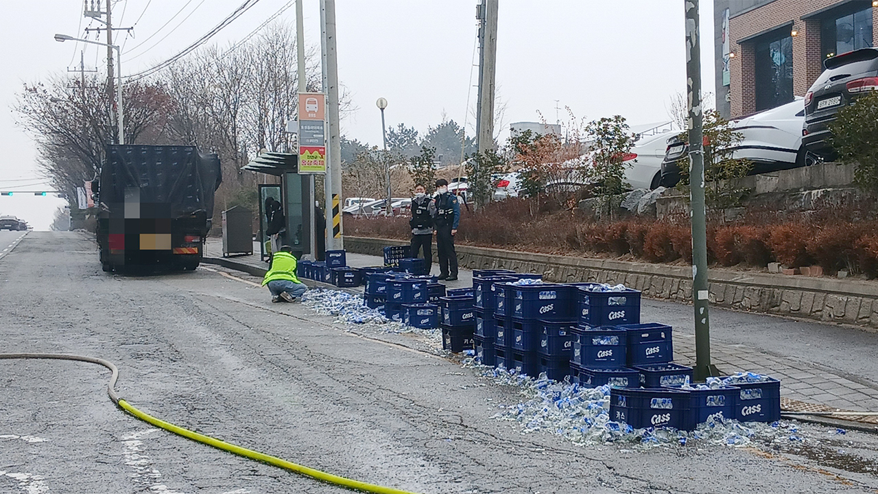 신고받고 출동한 경찰과 소방대원들은 1개 차로를 통제한 뒤 1시간 동안 깨진 맥주병과 상자를 정리했습니다.