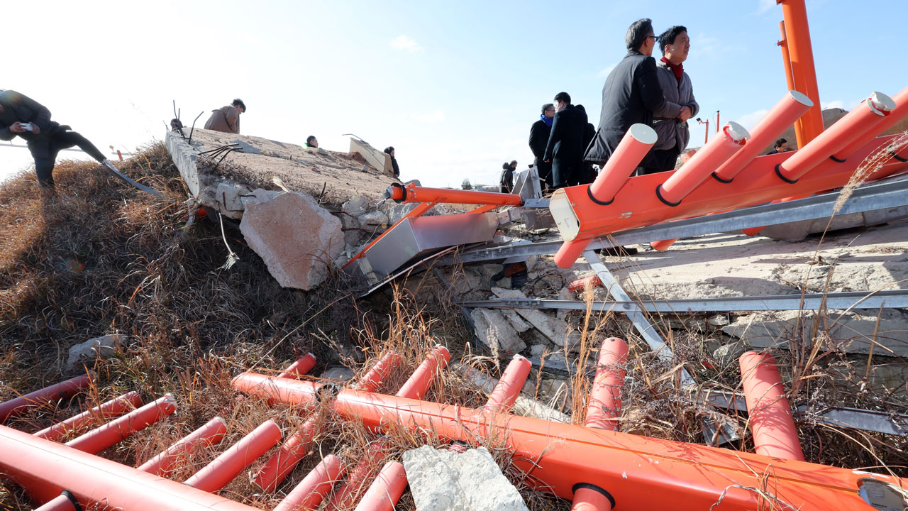 ▲ 지난달 20일 무안국제공항에서 열린 12·29 여객기 참사 진상규명을 위한 국정조사특별위원회 현장조사에서 위원들과 유가족들이 콘크리트 방위각 시설을 둘러보고 있다.