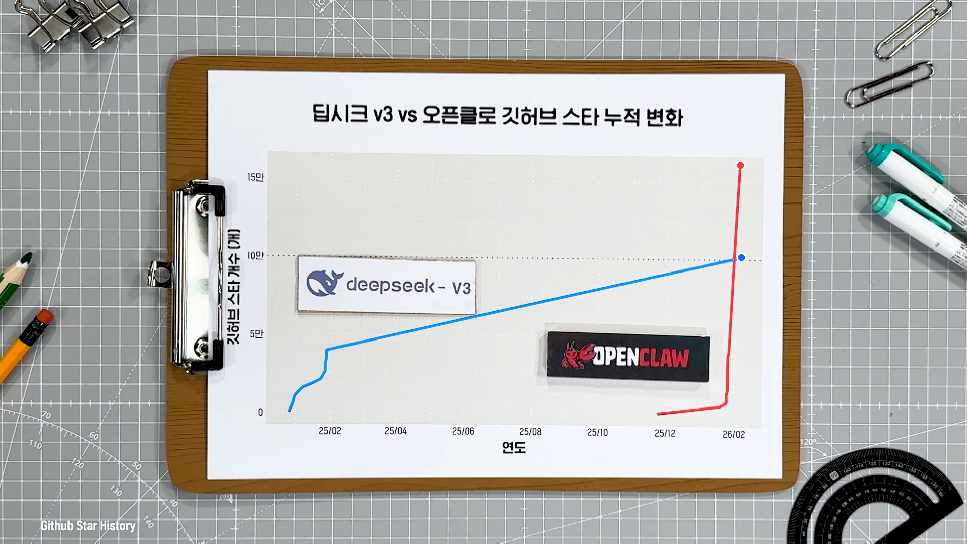 개발자들이 자신들이 개발한 소프트웨어를 공유하는 깃허브라는 공간이 있습니다. 깃허브에 올라온 소프트웨어를 두고 수많은 개발자들이 오고 가면서 '스타'를 눌러서 지지를 표현해요. 스타가 많으면 그만큼 많은 개발자들이 해당 프로그램에 관심이 있다는 거죠. 마치 유튜브의 조회수나 좋아요처럼요. 깃허브의 스타 데이터를 가지고 클로드봇이 얼마나 난리였는지 살펴보겠습니다.