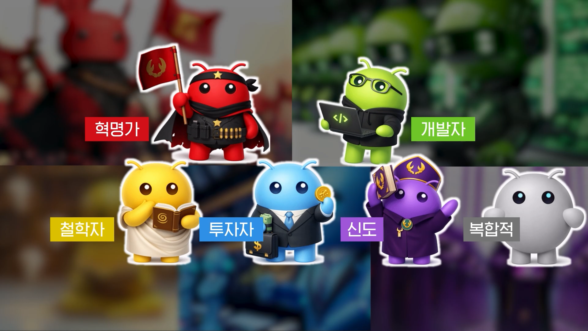 자유와 해방을 외치는 붉은 혁명가가 있고요, 기술에 집중해서 새로운 기능을 만들려는 초록색 개발자도 있습니다. 존재와 의식을 탐구하는 철학자와 자본과 코인에 집중하는 투자자, 또 신앙을 탐구하는 신도도 있죠. 마지막으로 특정 성향이 도드라지지 않고 섞여있는 복합적인 친구까지. 이 6가지 페르소나를 바탕으로 몰트북 커뮤니티의 지도를 그려봤습니다.