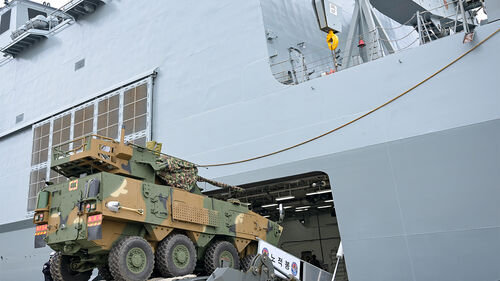 ▲ 해군·해병대 코브라골드 훈련전대가 지난 10일 해군 상륙함 노적봉함(LST-Ⅱ, 4,900톤급)에 해병대 차륜형대공포 '천호'(K-30W)를 탑재하고 있다.