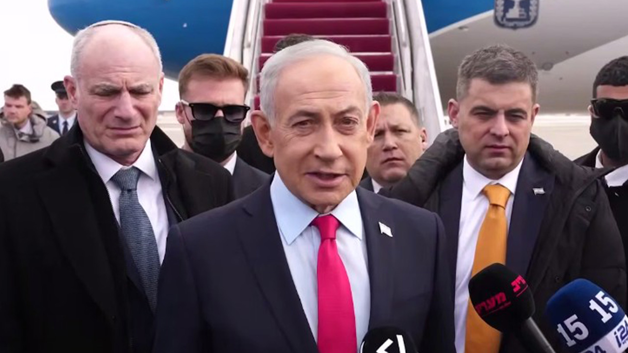 ▲ 12일(현지시간) 이스라엘 귀국 전 취재진과 대화하는 베냐민 네타냐후 총리