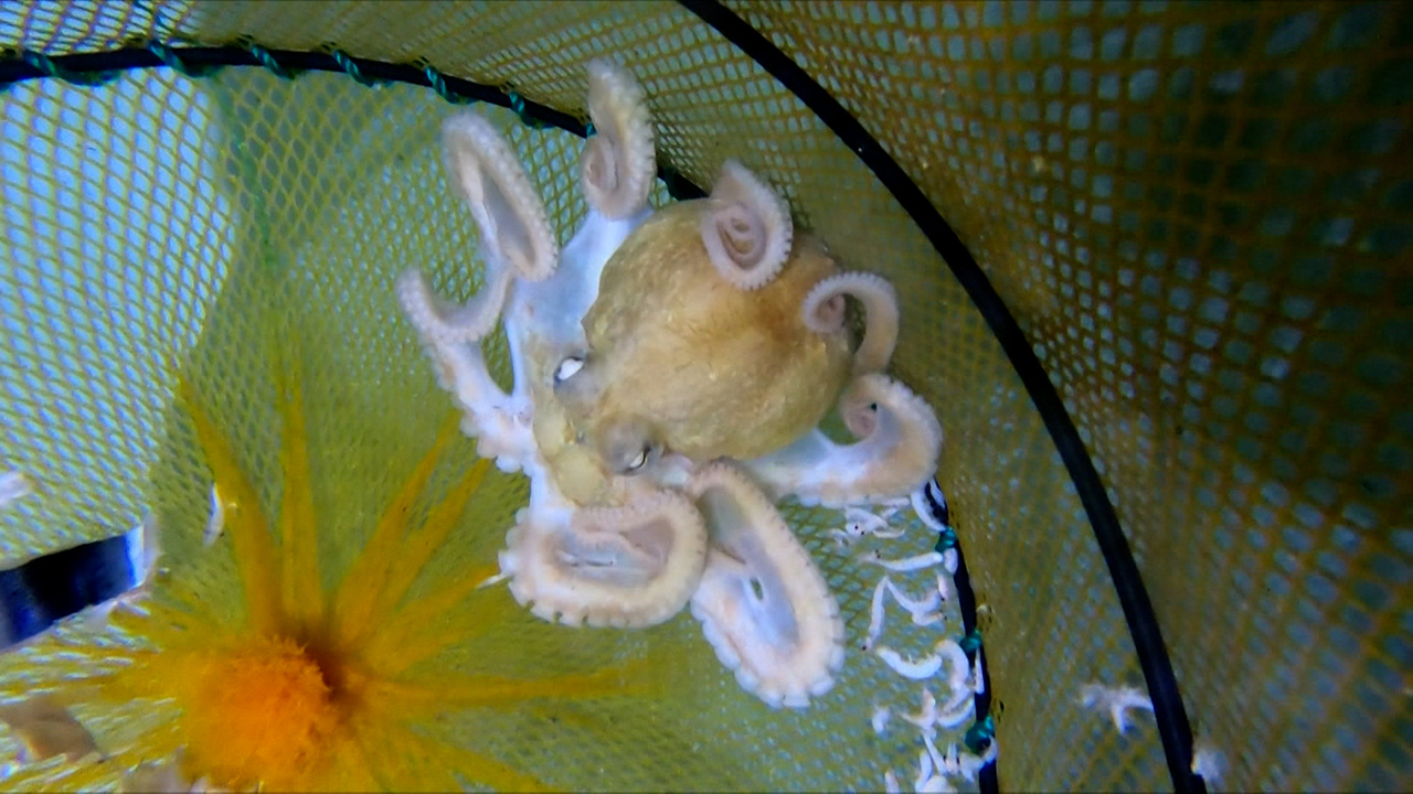 통발 속에는 또 다른 문어가 웅크리고 있습니다.