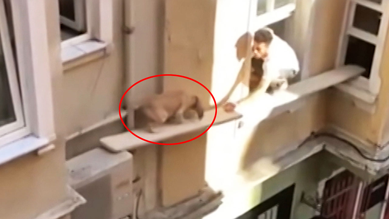 에어컨 실외기가 놓인 높은 난간에 떠돌이 개 한 마리가 불안하게 올라가 있는 걸 발견한 겁니다.