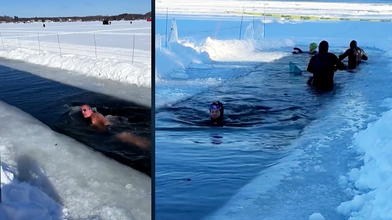 이 지역 주민들이 직접 공구로 얼음을 깨서 한파에 꽁꽁 언 호수를 약 23미터 길이의 천연 수영장으로 변신시킨 건데요.