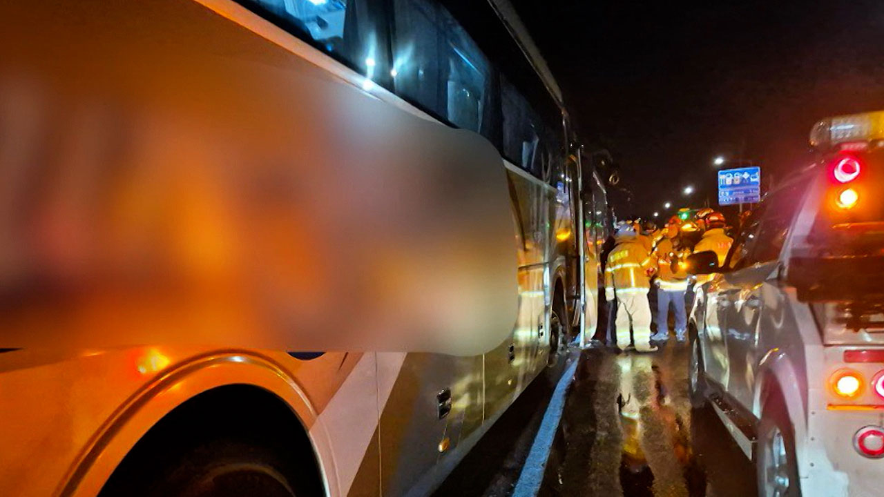 고속버스 앞 유리가 산산조각 났고, 바닥에는 범퍼에서 떨어져 나온 잔해가 널려 있습니다.