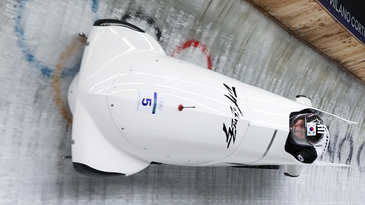 ▲ 17일(현지시간) 이탈리아 코르티나담페초 슬라이딩센터에서 열린 2026 밀라노·코르티나담페초 동계올림픽 봅슬레이 남자 2인승 3차 시기에서 김진수와 김형근이 질주하고 있다.
