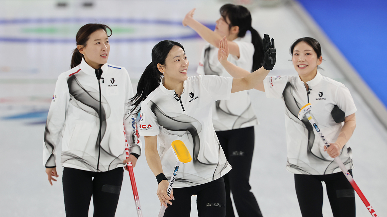 ▲ 현지 시간 18일 2026 밀라노·코르티나담페초 동계올림픽 컬링 여자 라운드로빈 한국과 스웨덴의 경기에서 8-3으로 승리를 거둔 한국 대표팀 선수들이 기뻐하고 있다.
