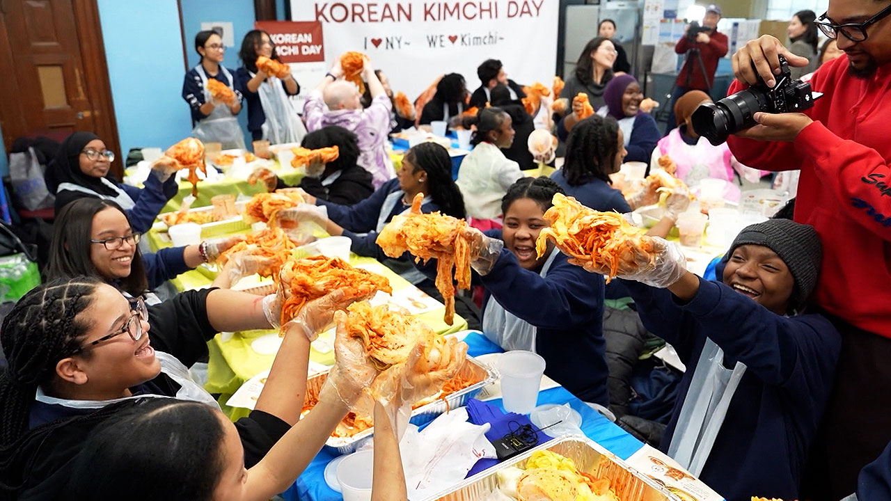 미국 뉴욕 맨해튼의 한 고등학교, 한국 설을 맞아서 열린 김치 담그기 행사에 100명이 넘는 학생들이 자원했습니다.