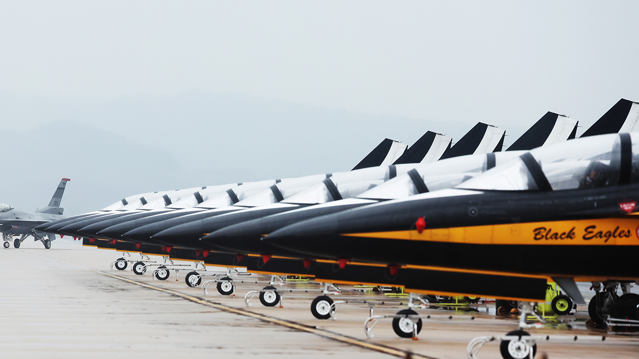 ▲ 지난해 5월 9일 경기도 평택시 주한미공군 오산기지에서 열린 '오산 에어 파워 데이 2025 미디어데이'에서 블랙이글스 비행기 옆으로 F-16 전투기가 지나가고 있다.