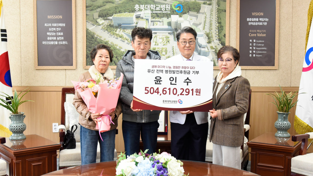 충북대학교병원은 청주에 살던 고 윤인수(56) 씨의 유족이 어제(19일) 병원을 찾아 고인의 전 재산 5억 400여만 원을 전달했다고 밝혔습니다.