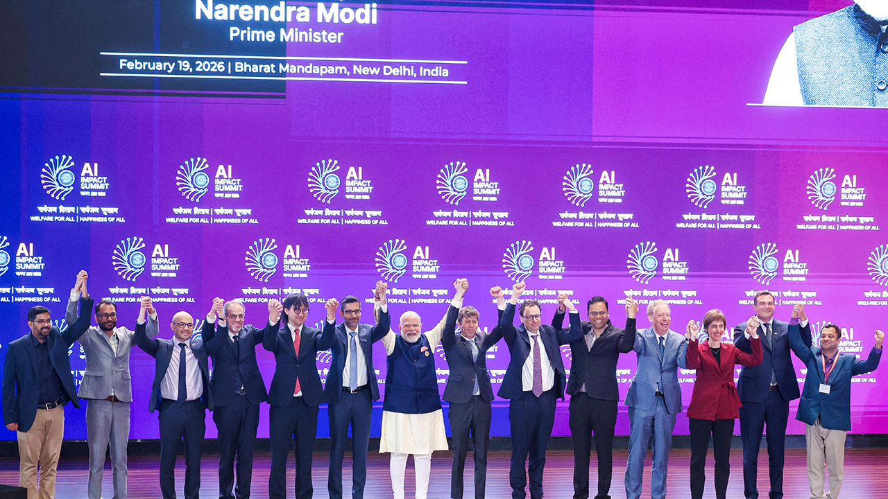 ▲ 현지 시간 지난 19일 인도 뉴델리에서 열린 '인공지능(AI) 임팩트 정상회의'에 참석한 나렌드라 모디 인도 총리(오른쪽에서 8번째) 등 인사들