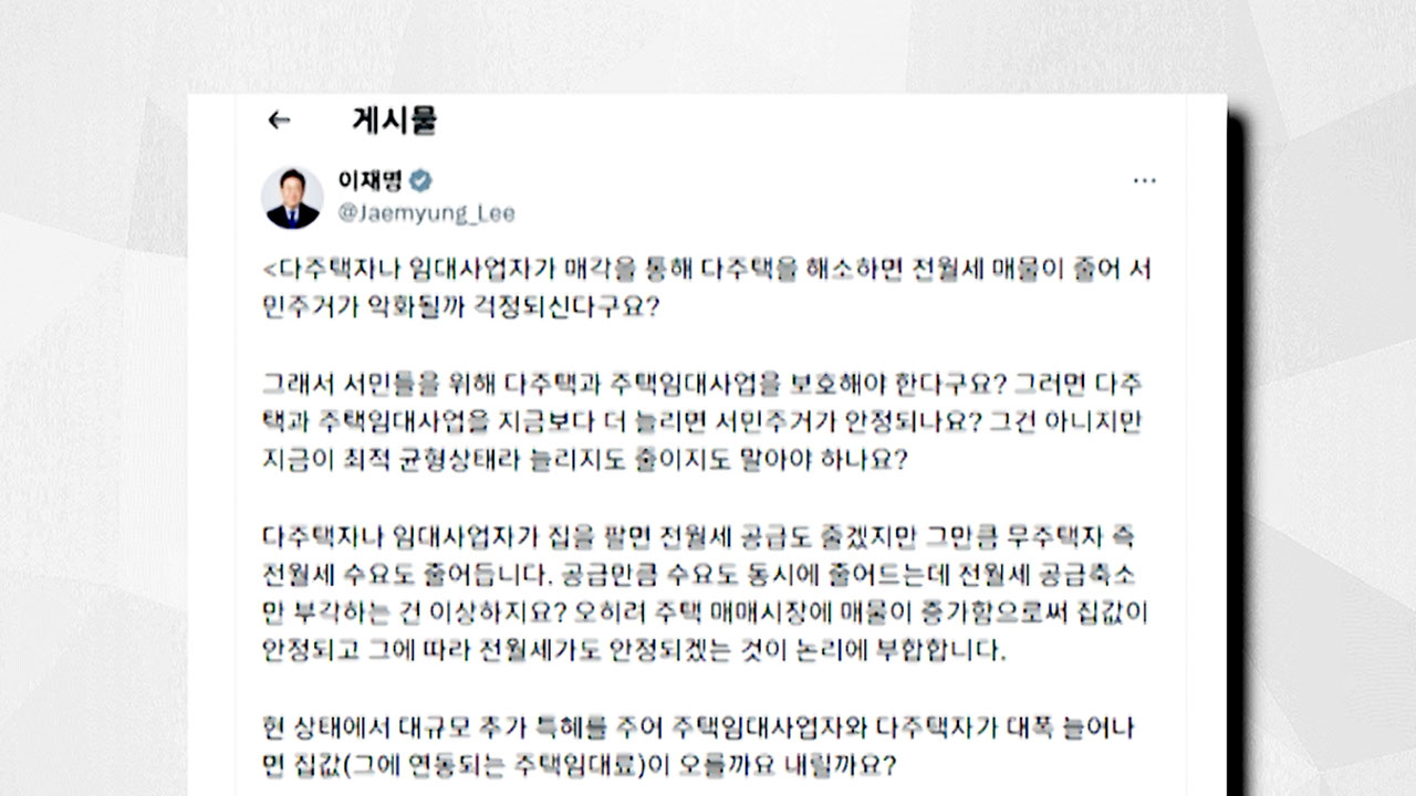 이 대통령은 어제(22일) 소셜미디어에 올린 글에서 박성훈 국민의힘 수석대변인의 '다주택자 규제 시 임대 공급 위축과 전월세 불안이 재연되면 그 책임은 대통령에게 있다'는 취지의 논평을 담은 기사를 인용하며 반박했습니다.