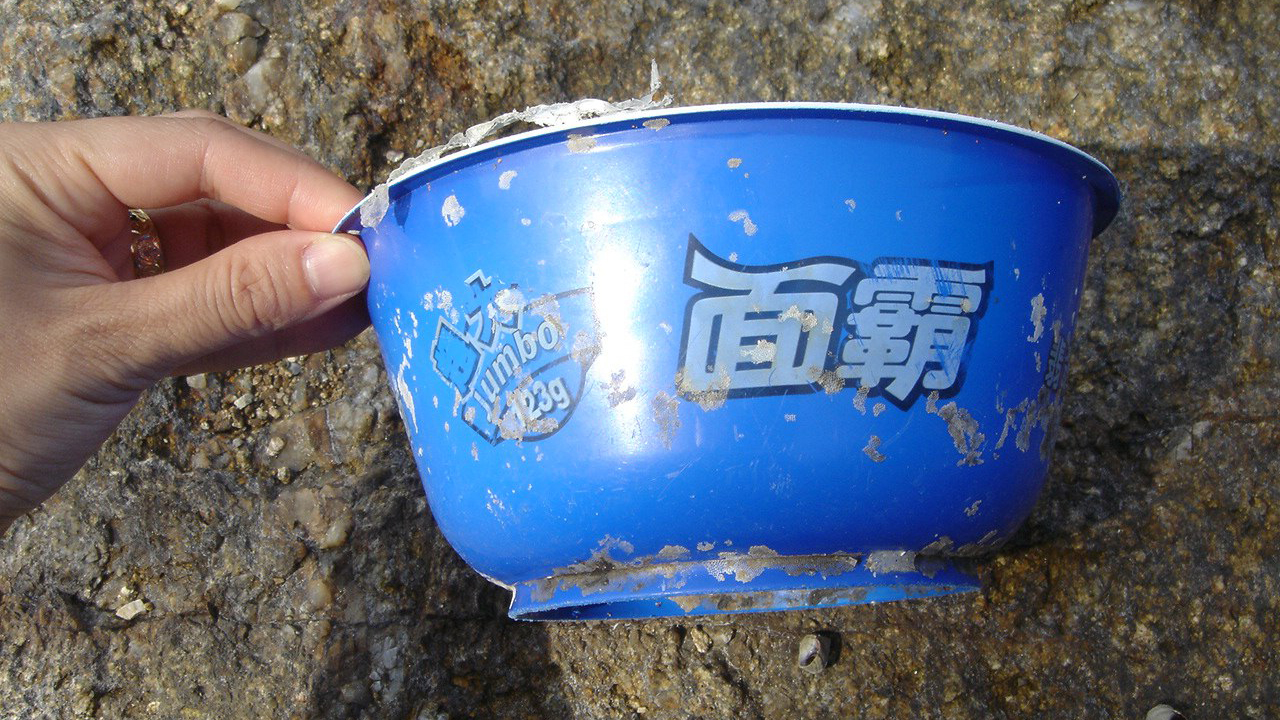 중국에서 제조된 즉석 면 용기가 해류를 따라 한국 연안까지 흘러 들어온 것입니다.