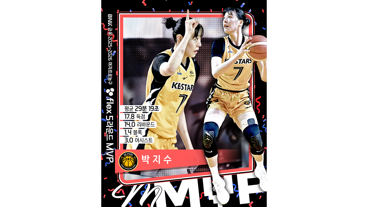 한국여자농구연맹(WKBL)은 BNK금융 2025-2026 여자프로농구 flex 정규리그 5라운드 최우수선수(MVP) 기자단 투표에서 박지수가 총 72표 중 69표를 받아 수상자로 선정됐다고 오늘(23일) 밝혔습니다.