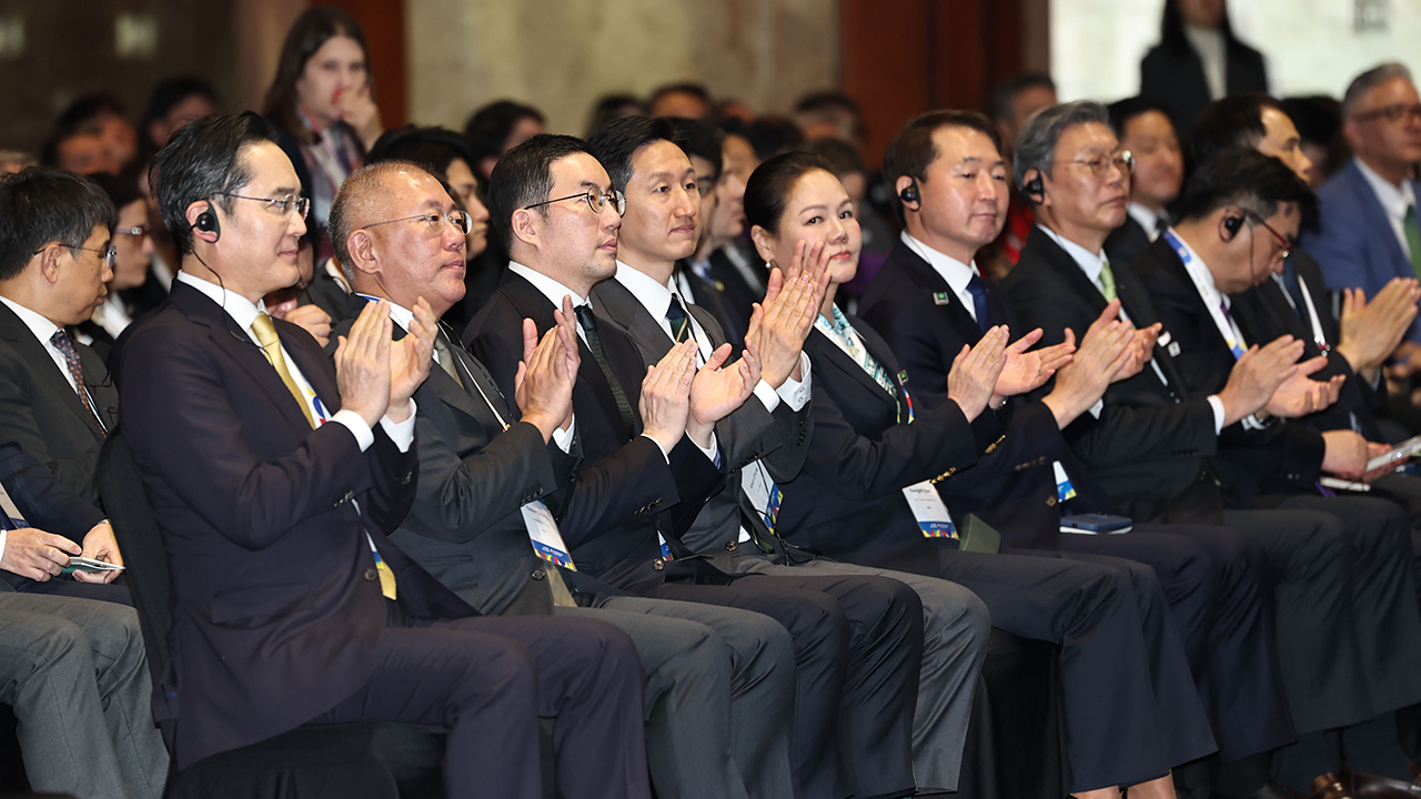 ▲ 이재용 삼성전자 회장, 정의선 현대차그룹 회장, 구광모 LG 회장, 정기선 HD현대 회장이 23일 서울 중구 롯데호텔에서 열린 '한국 브라질 비즈니스 포럼'에서 손뼉 치고 있다.