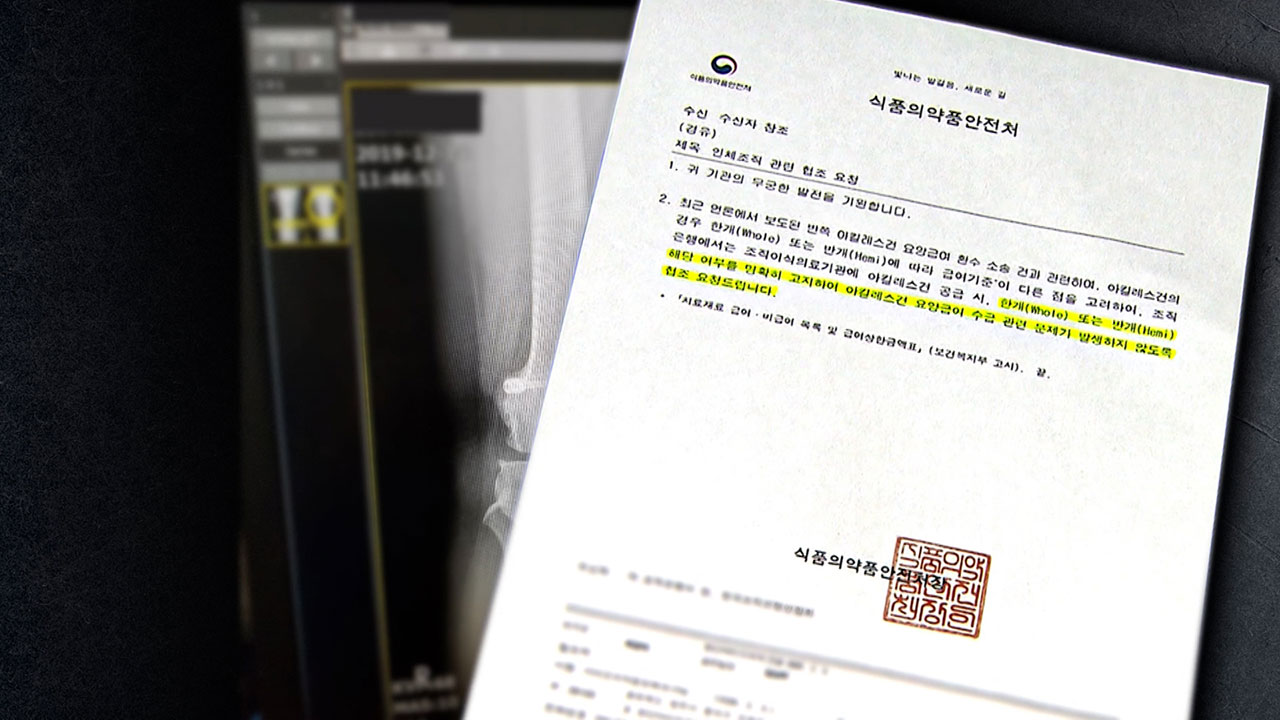 반쪽 아킬레스건을 온전한 제품인 것처럼 팔아 요양급여를 챙긴 업체들이 대거 무혐의 처분을 받았다는 소식, 지난달 단독 보도로 전해드렸습니다. 반쪽이라도 별도 사용 승인이 필요 없다는 식약처 입장이 주요 근거였는데, 저희 보도 이후 식약처 입장에 변화가 감지됐습니다. 제품이 한 개인지, 반 개인지 명확히 구분하라는 공문을 보낸 걸로 확인됐습니다.