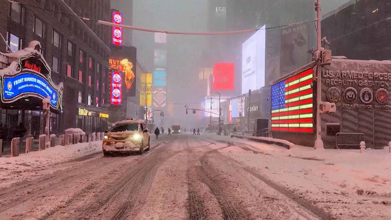 평소 같으면 출근하는 차들이 가득 찼을 뉴욕 맨해튼 도로에 눈발만 흩날립니다.