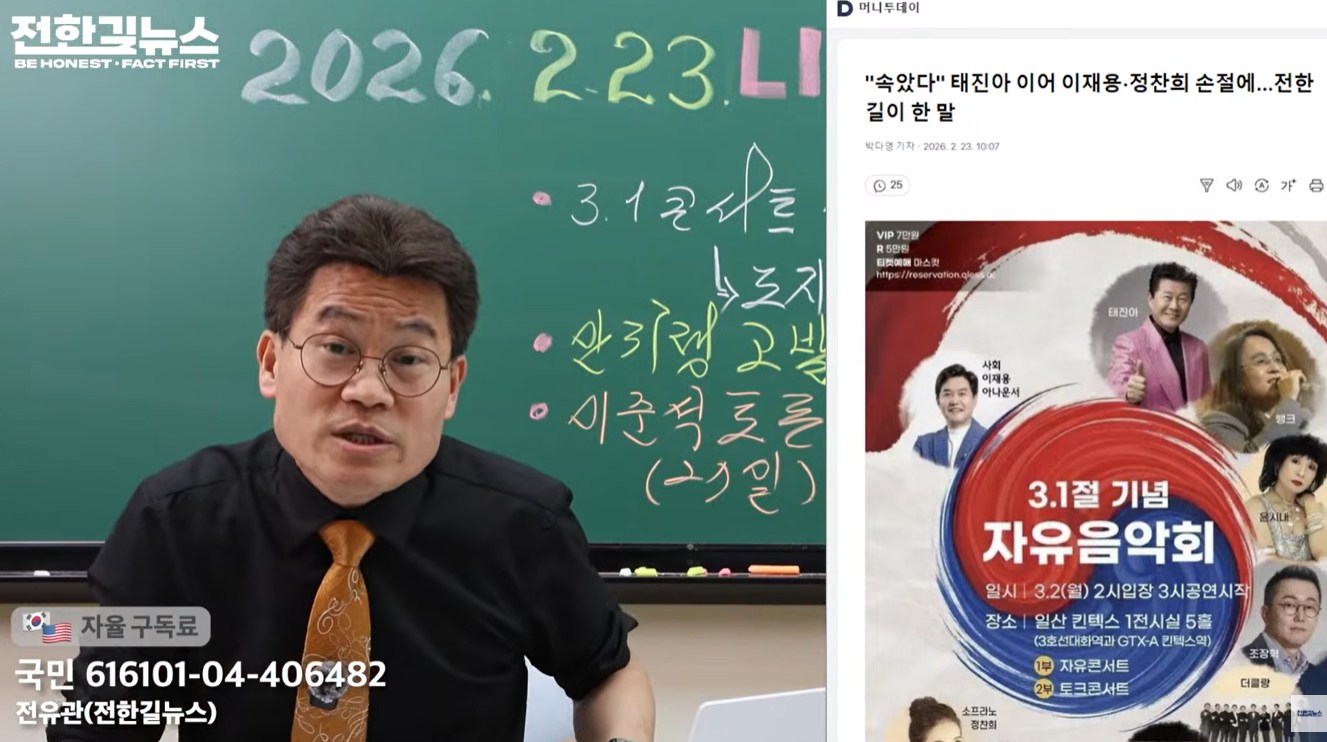 한국사 강사 출신 극우 성향 유튜버 전한길이 이른바 '3·1절 기념 자유음악회' 섭외 논란과 관련해 "태진아도 나도 피해자"라고 주장했다. 그러나 해당 공연은 결국 대관이 취소되며 무산 수순을 밟게 됐다.