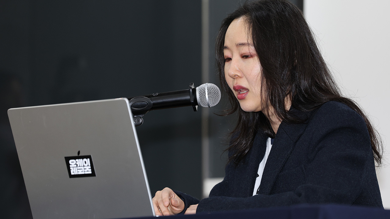 ▲ 민희진 어도어 전 대표가 25일 서울 종로구 교원챌린지홀에서 열린 민희진-하이브 간 풋옵션 소송 1심 승소 관련 기자회견에서 발언하고 있다.