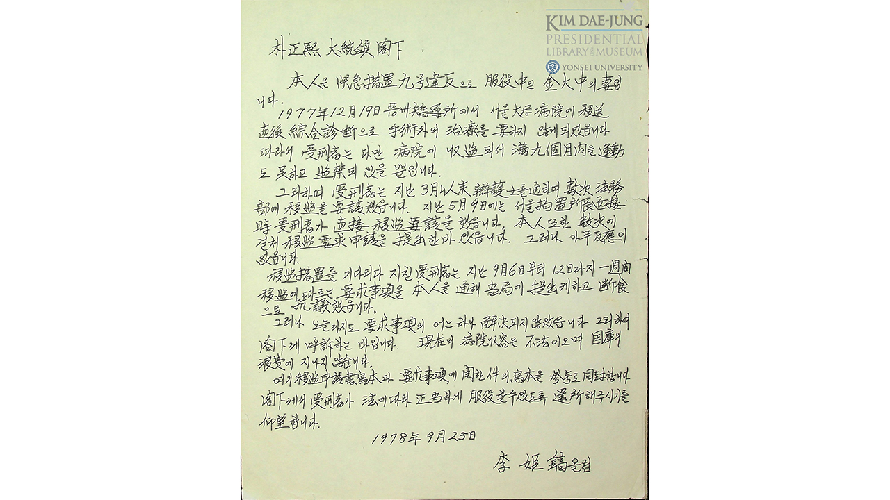 1978년 9월 25일자 서한에서 이 여사는 자신을 "긴급조치 9호 위반으로 복역 중인 김대중의 처"라고 밝히며 병원 수감이 치료 목적이 아님에도 장기간 계속되고 있다고 주장했습니다.