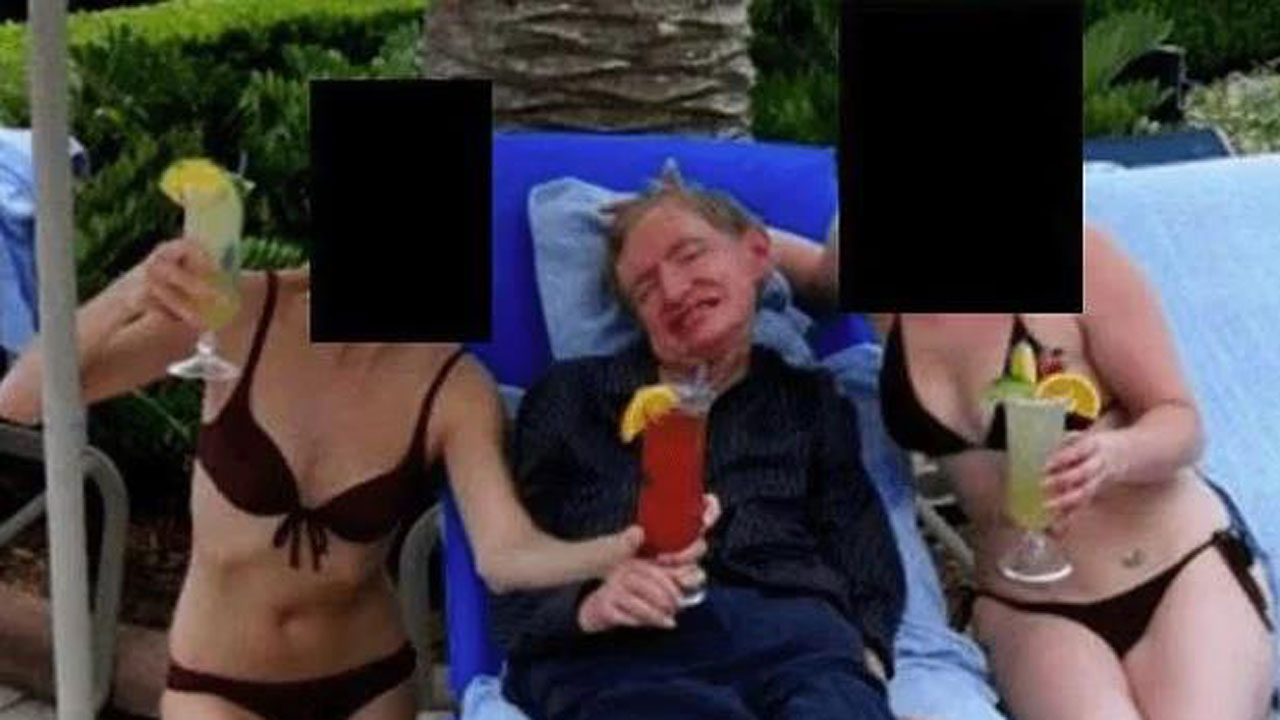 사진 속 호킹은 선베드에 누워 있으며, 그의 양옆에서는 비키니 차림의 여성들이 칵테일을 들고 포즈를 취하고 있습니다.