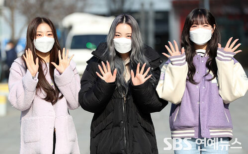 Billlie’s SHEON (from left), SUHYEON, and MOON SUA strike a pose as they enter the SBS headquarters in Mok-dong, Yangcheon-gu, Seoul, on Dec. 23 for a pre-recording of SBS PowerFM’s Cultwo Show.Copyright Ⓒ SBS. All rights reserved. 무단 전재, 재배포 및 AI학습 이용 금지