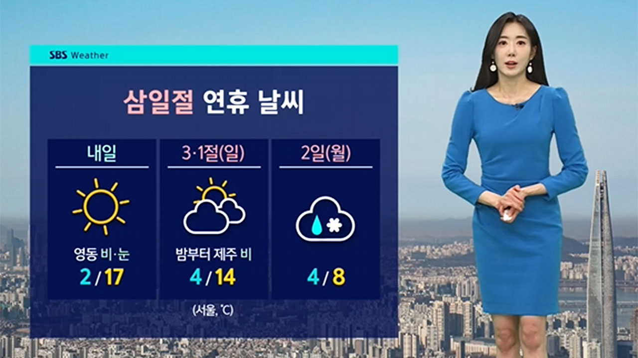 3·1절에는 날이 차츰 흐려져 밤에 제주부터 비가 시작되겠고, 대체 휴일인 월요일에는 전국에 비나 눈이 내리겠습니다.