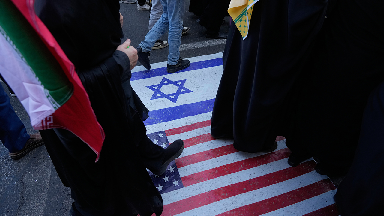 ▲ 이란 테헤란에서 열린 주이란 미국대사관 점거 46주년 행사 참여자들이 미국과 이스라엘 국기를 상징하는 깃발 위를 걷고 있다.