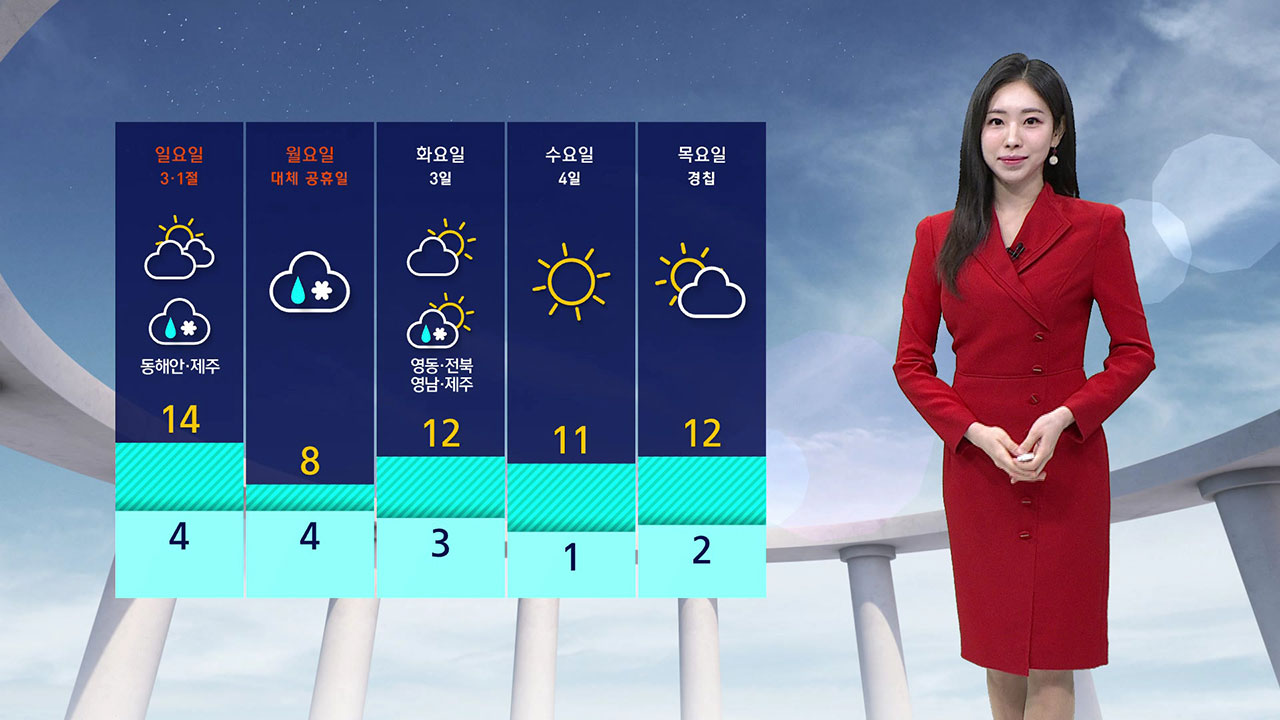 월요일에 비나 눈이 오면서 기온이 다소 낮아지겠지만 이후로는 다시 온화해지겠습니다.