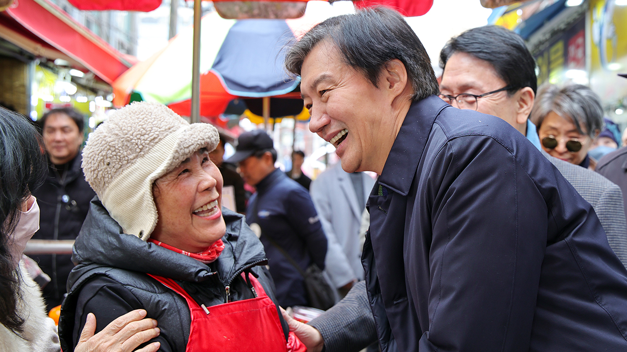 ▲ 조국혁신당 조국 대표가 지난달 28일 부산 기장시장을 방문해 상인들을 만나고 있다.