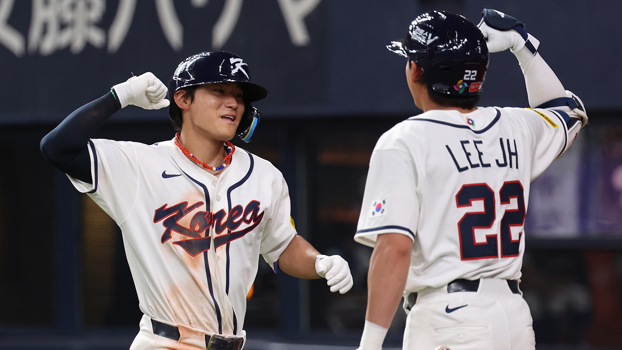 ▲ 지난 2일 일본 오사카 교세라돔에서 열린 월드베이스볼클래식(WBC) 평가전 한국 대표팀과 일본 프로야구 한신 타이거스와의 경기에서 김도영이 솔로홈런을 친 뒤 이정후와 기쁨을 나누고 있다