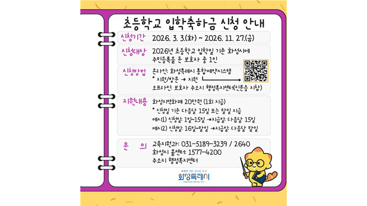 경기도 화성특례시는 올해 초등학교에 입학하는 아동들에게 1인당 20만 원의 입학축하금을 지역화폐로 지급한다고 3일 밝혔습니다.