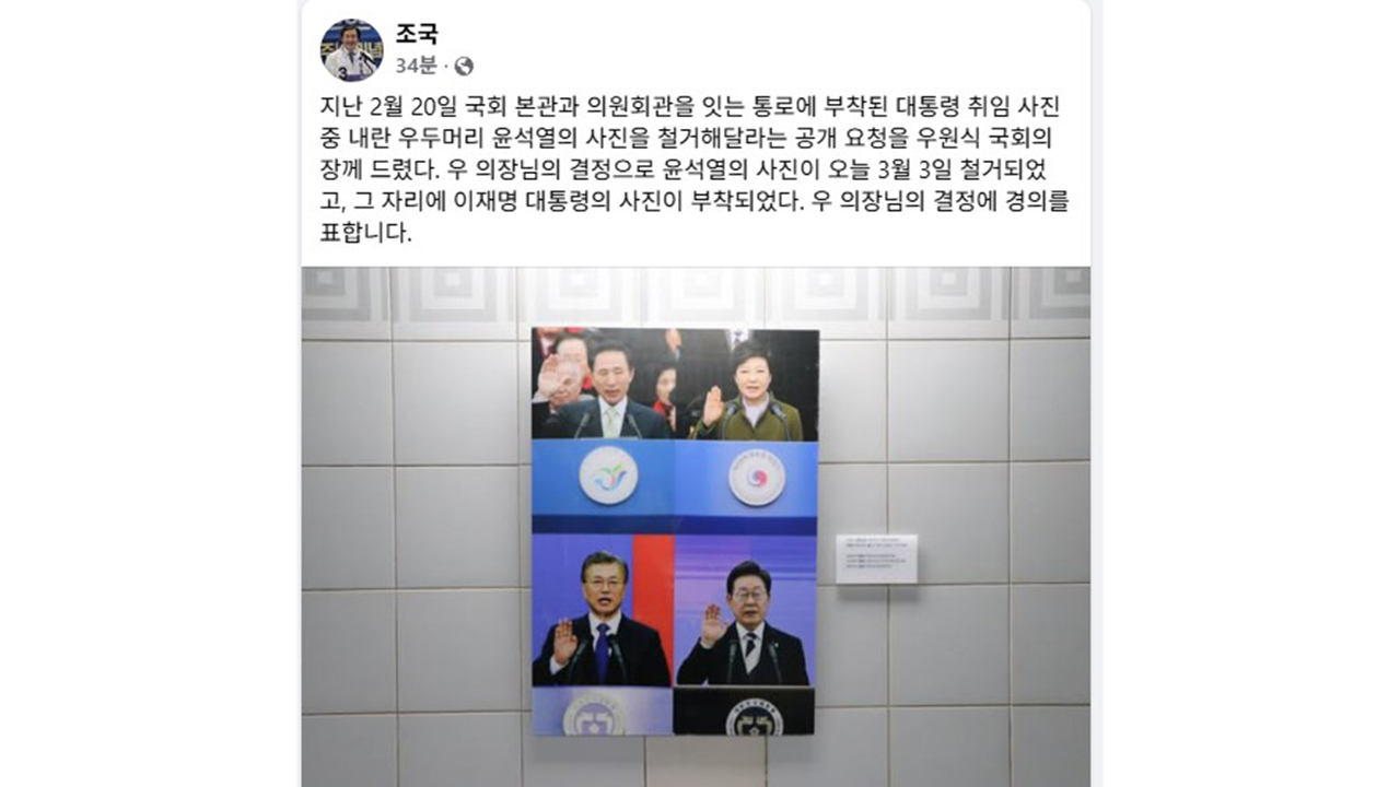 조 대표는 페이스북을 통해 "우 의장님의 결정으로 윤석열의 사진이 오늘 철거됐고 그 자리에 이재명 대통령의 사진이 부착됐다"며 "우 의장님의 결정에 경의를 표한다"고 환영했습니다.